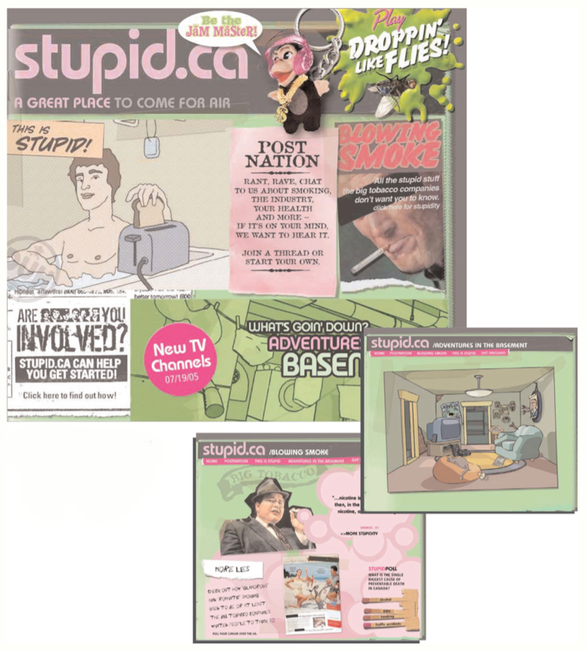 'Stupid' was an award-winning anti-smoking campaign for the Ontario Ministry of Health aimed at reducing smoking among 12-15-year-olds. Launched in 2004, it used humor, not lectures, to show smoking isn’t cool. The campaign featured a concert tour with MuchMusic, TV and cinema spots, print ads, and the Stupid.ca website, which attracted 1.2 million unique visitors. It achieved 91% acknowledgment among teens that the ads could deter smoking, with a 2% drop in youth smoking rates and a 9% rise in teens who never started. The campaign won two Gold Cassies and was a finalist at Cannes and the One Show.